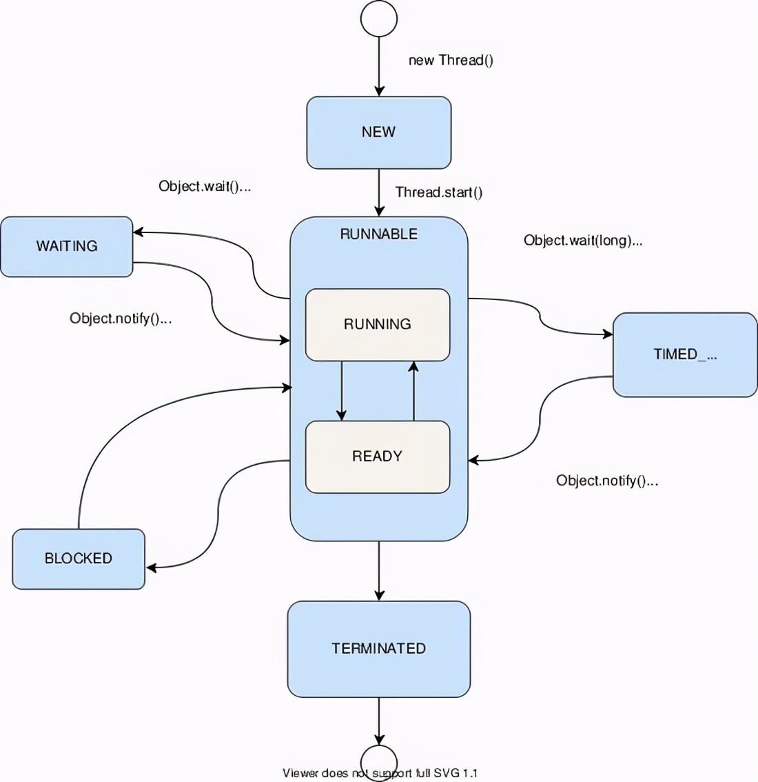 当一个线程执行完毕(或者调用已经不建议的 stop 方法),线程的状态就变为 TERMINATED。进入TERMINATED后,线程的状态不可逆,无法再复活。