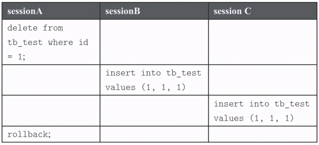 session A 首先获取主键记录 1 上的排他锁,接下来 session B 和 session C 的插入操作都会得到主键冲突,因此会各自获取主键记录上的共享锁。然后 session A 回滚,此时 session B 和 session C 都尝试获取排他锁,但是被对方的共享锁阻塞,从而发生死锁。