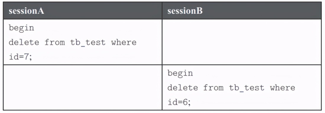 分析上述会话,session A 第一条 delete 语句,会获取 Next-Key lock,由于查询条件 id 是唯一索引,因此会退化为间隙锁(表中并不存在对应的记录,不会退化为行锁): (5, 10) ; 同样地,session B 的 delete 语句也会获取间隙锁。