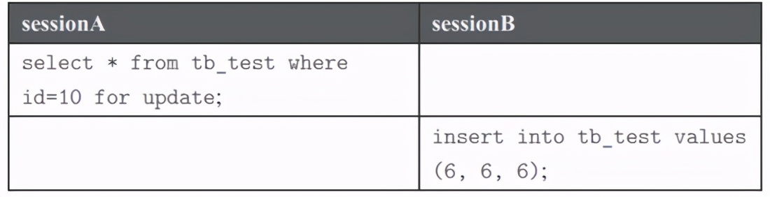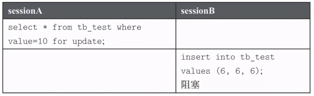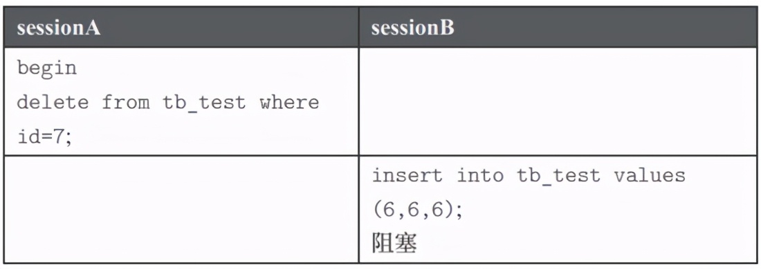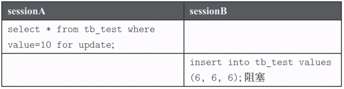 按照前面的讨论,两个会话都会获取 (5,10) 之间的间隙锁,那么 session B 是否会被 session A 阻塞?实际情况是并不会阻塞,这是因为: 间隙锁之间并不会相互阻塞,无论锁的类型是 X 还是 S,间隙锁的目的是为了阻止其他会话插入对应的区间,因此也仅会阻塞其他会话的插入操作。