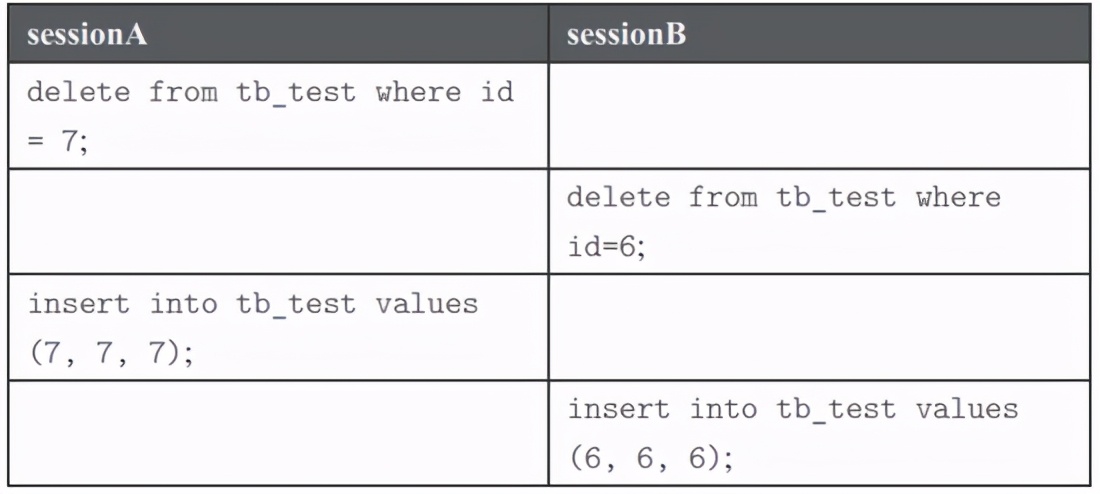 由于间隙锁之间不会冲突,因此两个会话的 delete 语句都成功获取锁。接下来,session A 执行插入操作,获取插入意向锁,被 session B 获取的间隙锁阻塞,接着 session B 同样执行插入操作,被 session A 阻塞。此时产生死锁,某一个会话的事务被回滚。另一个会话的插入操作则执行成功。