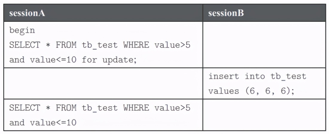 因此,只有将数据库的隔离级别设置为等于或者高于 REPEATABLE READ ,上述场景才会出现会话之间阻塞的情况。如果将隔离级别设置为 READ COMMITED ,则不会出现相应的阻塞,因为在此时的隔离级别下,容忍幻读的存在。