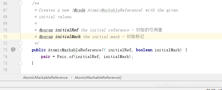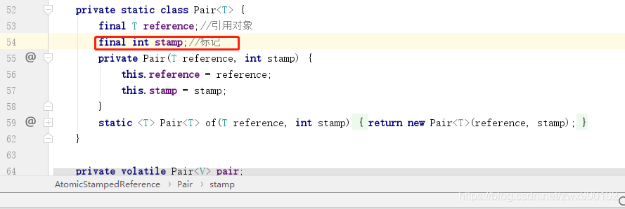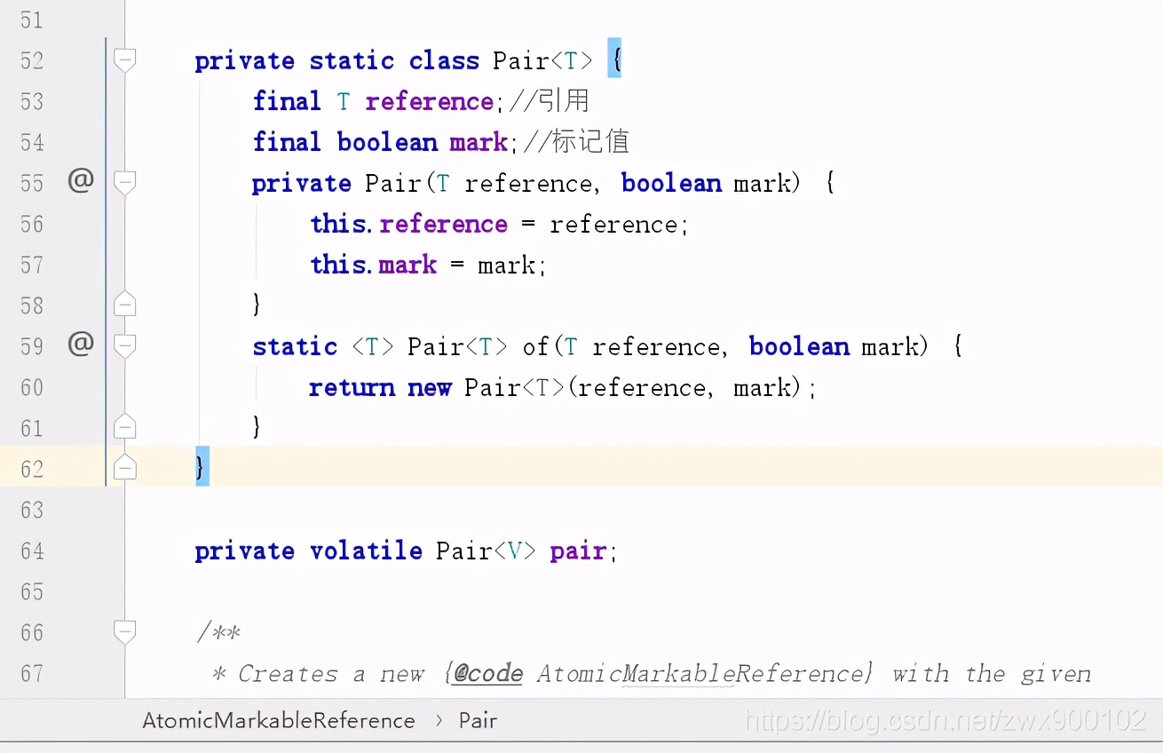 初始化对象的时候需要初始化一个引用对象和一个初始mark,而这两个属性又是通过其静态内部类Pair来管理的:
