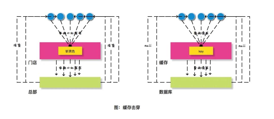 或者如果有多家门店同时卖完了,那么总部接收到的咨询量就会剧增。类似这种情况,在缓存领域有一个类似的概念叫做缓存击穿。