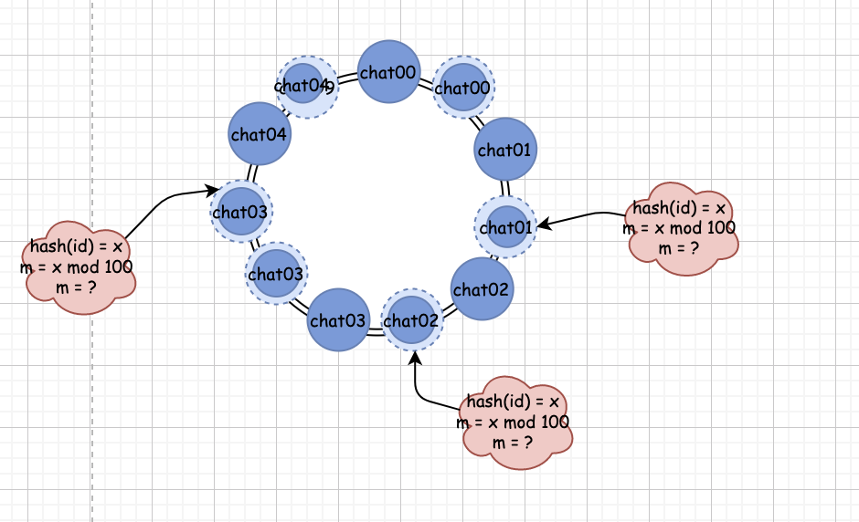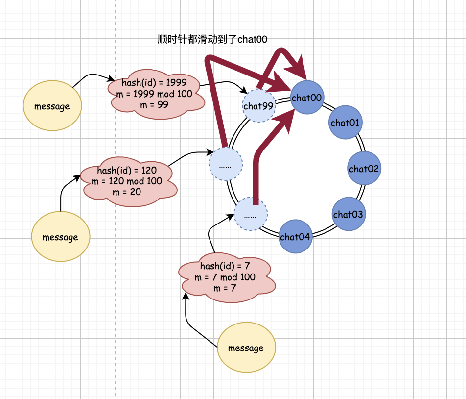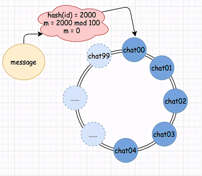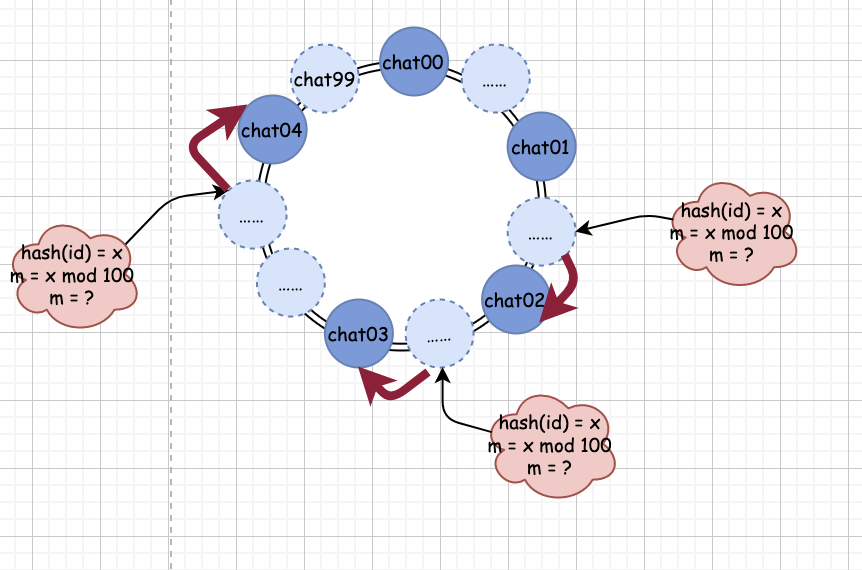 如果 hash(chat00) mod 100 = 31,那么 31 号的位置就对应于 chat00,以后所有 m = hash(id) mod 100 中 m = 31的所对应的消息就会直接被发送到 chat00 队列。