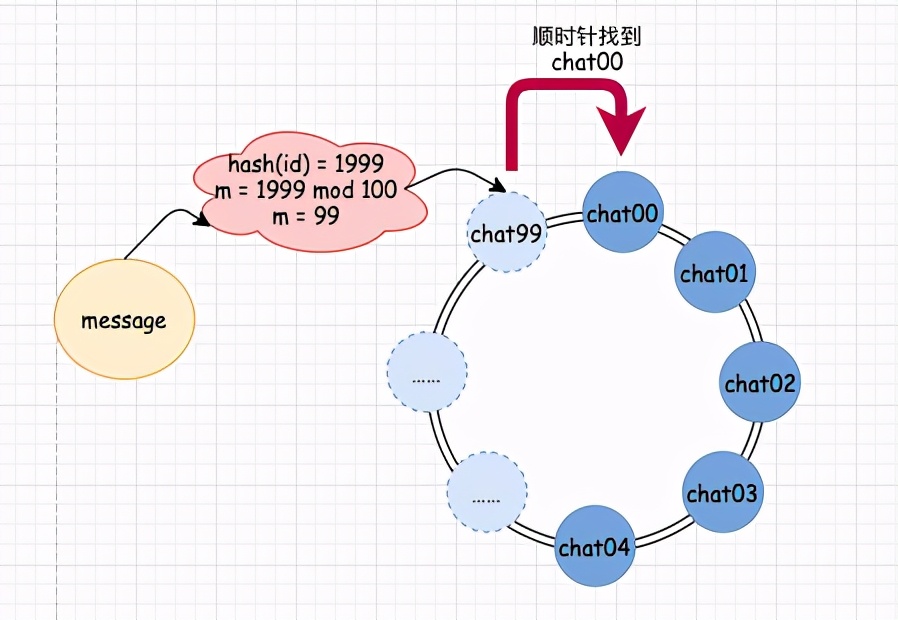 如果我们的 hash(id) 的结果为 1999,那么算出的队列编号 m = 99。此时,我们去查队列映射关系,发现 99 编号并没有对应的真实队列。这时候怎么办?很简单,我们顺时针继续往下找,找到谁了呢?0 对应的 chat00 队列,这是真实存在的,这时候,我们就将消息发送到 chat00 队列中。