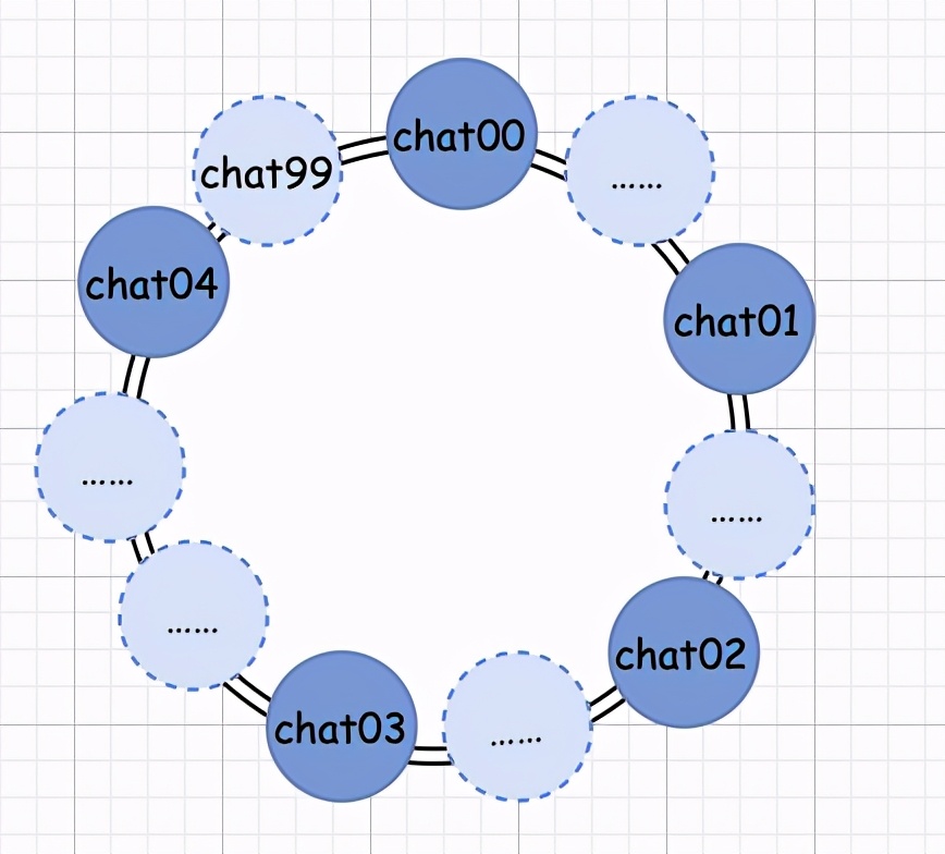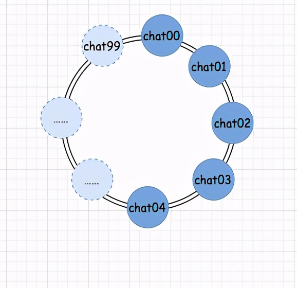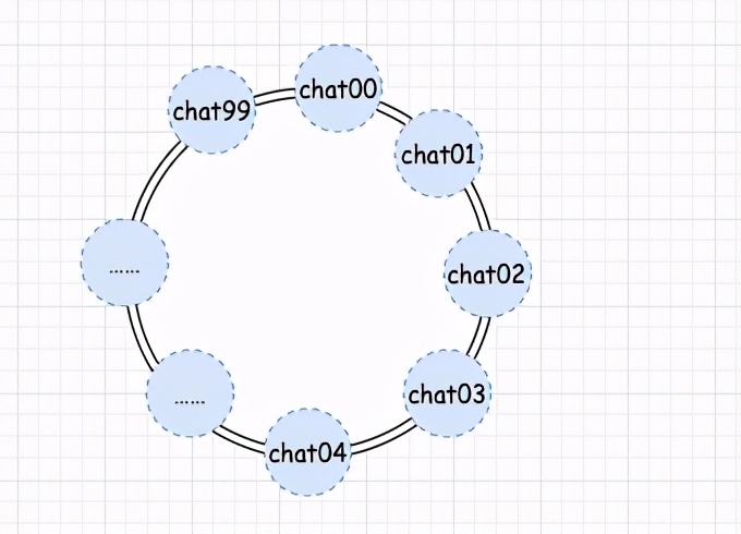 第一步,我们假设有个 100 个收发聊天信息的队列,并且这些队列处于一个环上。