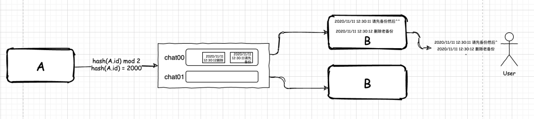 假设,hash(id) 的结果为 2000,n 为 2,经过计算 m = 0。此时,A 就会把他和 B 的对话信息都发送到 chat00 的队列里。B 收到消息后,就会依次显示给终端用户。这样,聊天乱序的问题就解决了。