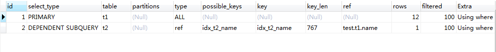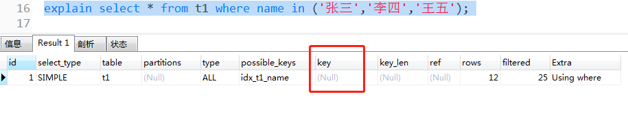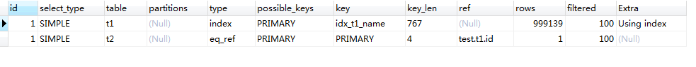 2、t1 不走索引,t2不走索引。(此种情况,实测若把name改为唯一索引,则t1也会走索引)