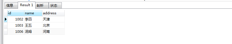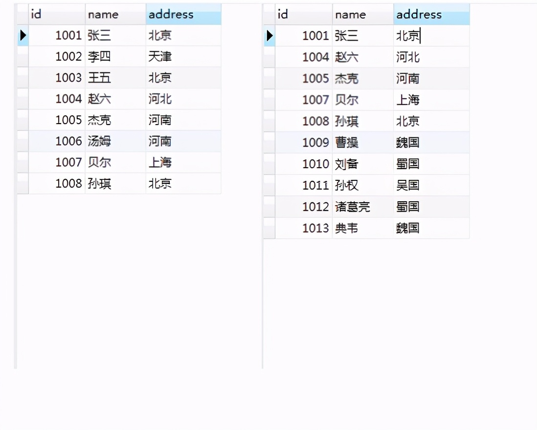 INSERT INTO `t1` VALUES ('1001', '张三', '北京'), ('1002', '李四', '天津'), ('1003', '王五', '北京'), ('1004', '赵六', '河北'), ('1005', '杰克', '河南'), ('1006', '汤姆', '河南'), ('1007', '贝尔', '上海'), ('1008', '孙琪', '北京');