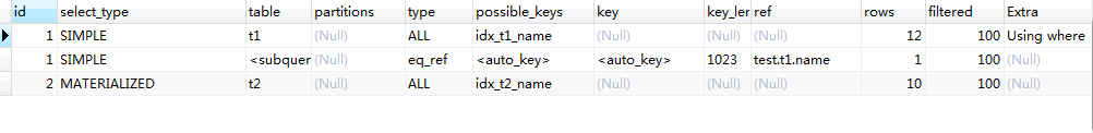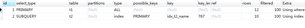 可以发现,对于 in 来说,大表 t2 做外表还是内表,都会走索引的,小表 t1 做内表时也会走索引。看它们的 rows 一列也可以看出来,前两张图结果一样。