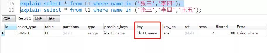 一、分别执行以下语句,主键索引(id)和普通索引(name),在 in , not in 下是否走索引。