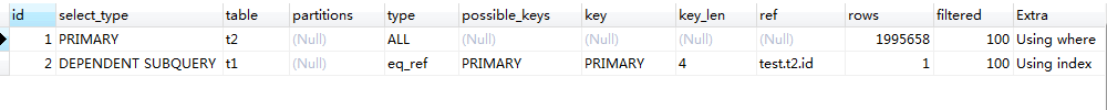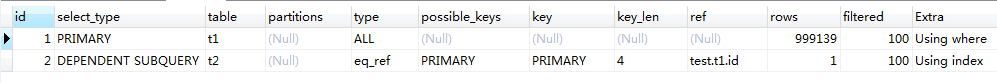 对于 exists 来说,当小表 t1 做外表时,t1 全表扫描,rows 近 100W;当 大表 t2 做外表时, t2 全表扫描,rows 近 200W 。这也是为什么 t2 做外表时,执行效率非常低的原因。