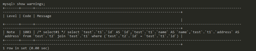 -- 本意为显示警告信息。但是和 explain 一块儿使用,就会显示出优化后的sql。需要注意使用顺序。
