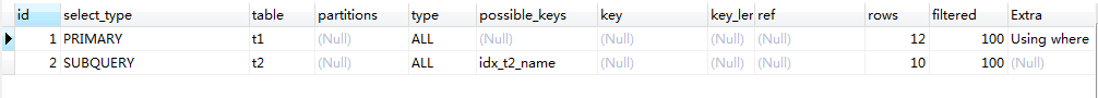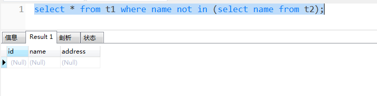 在使用 not in 的时候,需要保证子查询的匹配字段是非空的。如,此表 t2 中的 name 需要有非空限制。如若不然,就会导致 not in 返回的整个结果集为空。