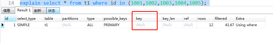 explain select * from t1 where id in (1001,1002,1003,1004,1005);