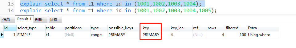 explain select * from t1 where id in (1001,1002,1003,1004);