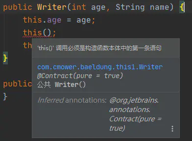 需要注意的是,this() 必须是构造方法中的第一条语句,否则就会报错。