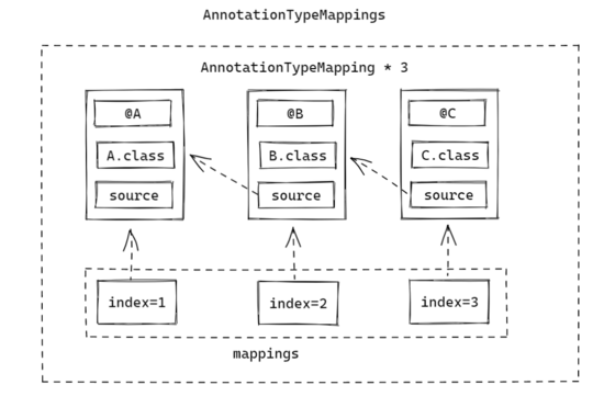 AnnotationTypeMapping后,以根注解为单位将AnnotationTypeMapping聚合为AnnotationTypeMappings; -