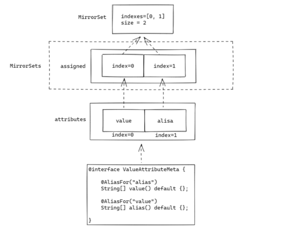 @AlisaFor指定或属性名相同——的元注解属性,通过annotationValueSource和annotationValueMappings数组在对应元注解属性的下标处,记录子注解与子注解指定的别名属性下标; -