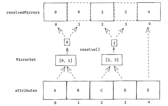 MirrorSet建立属性在AttributeMethods中对应下标的映射关系,全部互为别名的属性最终聚合为MirrorSets。遍历