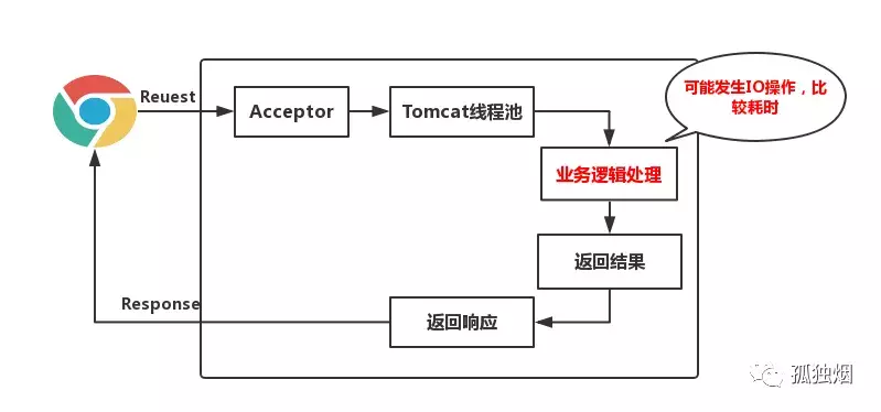 缺点很明显啦 ,业务逻辑线程和servlet容器线程是同一个,一般的业务逻辑总得发生点IO,比如查询数据库,比如产生RPC调用,这个时候就会发生阻塞,而我们的servlet容器线程肯定是有限的,当servlet容器线程都被阻塞的时候我们的服务这个时候就会发生拒绝访问,从而吞吐量上不去!