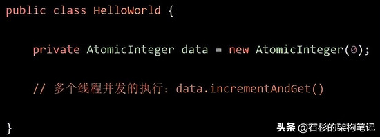 大家看上面的代码,是不是很简单!多个线程可以并发的执行AtomicInteger的incrementAndGet()方法,意思就是给我把data的值累加1,接着返回累加后最新的值。