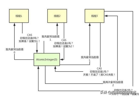 然后再次发起CAS操作,问问,现在值是2吗?是的!太好了,没人改,我抓紧改,此时AtomicInteger值变为3!