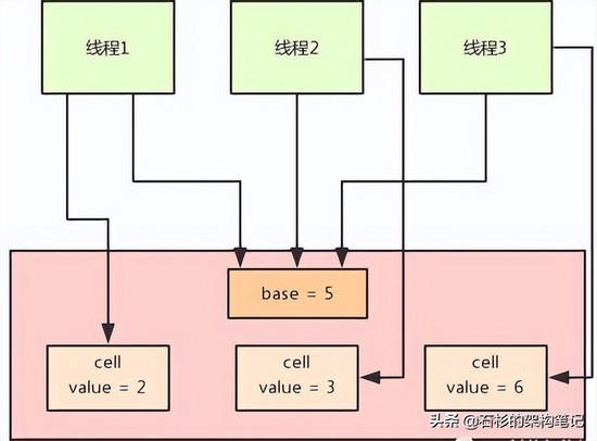 这时,让大量的线程分别去对不同Cell内部的value值进行CAS累加操作,这样就把CAS计算压力分散到了不同的Cell分段数值中了!