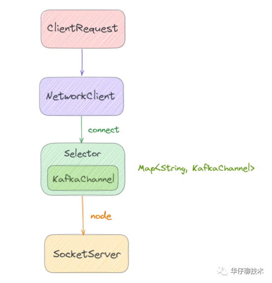 我们先看下连接过程,客户端在和节点连接的时候,会创建和服务端的 SocketChannel 连接通道。Kselector 维护了每个目标节点对应的 KafkaChannel。