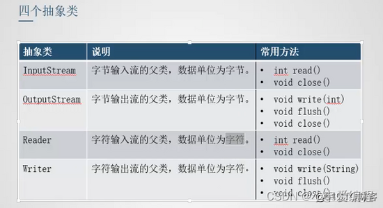 在Java里面分为字节流与字符流,其中字节流通常以Stream结尾,而字符流通常以Reader、Writer结尾。