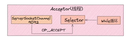 Acceptor 线程会创建 NIO Selector 对象,并创建 ServerSocketChannel 实例,然后将 Channel 和 OP_ACCEPT 事件绑定到 Selector 多路复用器上。