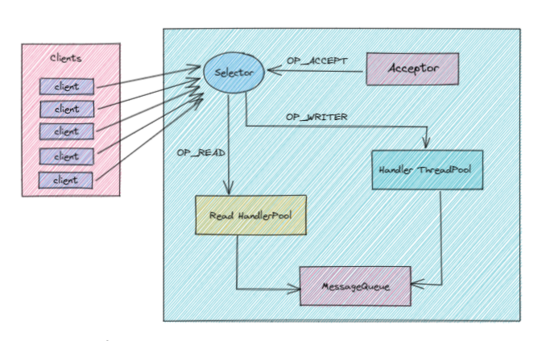 在上图中我们看到在整个流程中还有一个 MessageQueue 的队列组件存在, 为什么要加这个组件呢?我们可以想象一下, 如果请求量非常大,直接交给 Handler ThreadPool 线程池进行处理, 可能会出现该线程池处理不过来的情况发生,如果处理不过来,也会出现阻塞瓶颈。所以这里我们在 Server 端内部也设计一个消息队列, 起到一个缓冲的作用,Handler ThreadPool 线程池会根据自己的负载能力进行处理。