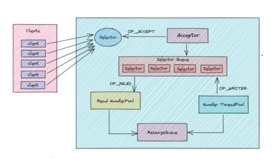 那么对于我们接收请求、处理请求、返回状态操作都会交由多 Selector 处理队列,至于这里到底需要多少个 Selector,又会跟什么参数和配置有关系,我们后续再进行分析,总之这里记住有多个 Selector 就行了,这样系统压力就会被分散处理。