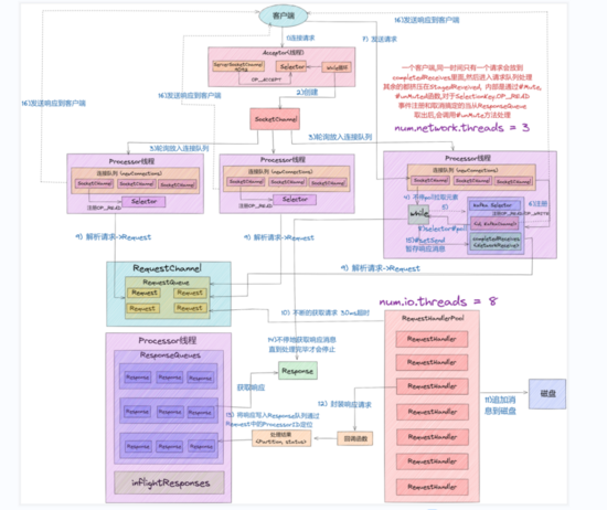 下面我们结合 Kafka 超高并发网络架构图来讲解下一个完整请求处理核心流程: