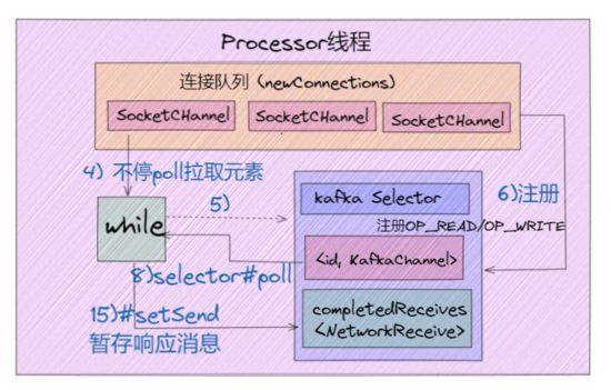 Processor 线程向 SocketChannel 注册了 OP_READ/OP_WRITE 事件,这样 客户端发过来的请求就会被该 SocketChannel 对象获取到,具体就是CompleteReceives。