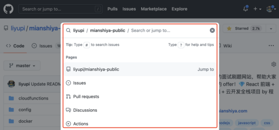 除了快捷键,GitHub 其实还藏着一个命令面板,按 ctrl + k 打开,然后就可以快速查看内容,高效执行各种操作了,感兴趣的同学依然可以从官方文档去了解,这里不再赘述。