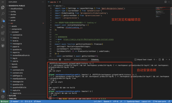 依托于 GitPod,我们不仅在一个网页编辑器中打开了项目代码、可以实时编辑和保存;而且它自动识别了项目的类型,并且自动安装了依赖包。