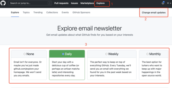 除了主动搜索项目外,其实在 GitHub 的 Explorer 探索页面中,有一个非常不起眼的按钮 —— 获取邮件更新。