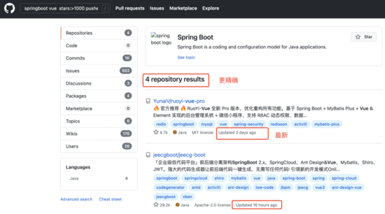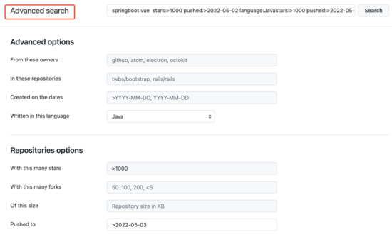 按快捷键 s 直接聚焦到搜索框,然后输入一串神秘代码: springboot vue stars:>1000 pushed:>2022-05-02 language:Java ,再按回车搜索,就能轻松快速地得到精确的、最新的结果。