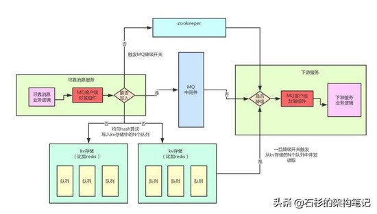 下游服务消费MQ也是通过自行封装的组件来做的,此时那个组件如果从zk感知到降级开关打开了,首先会判断自己是否还能继续从MQ消费到数据?