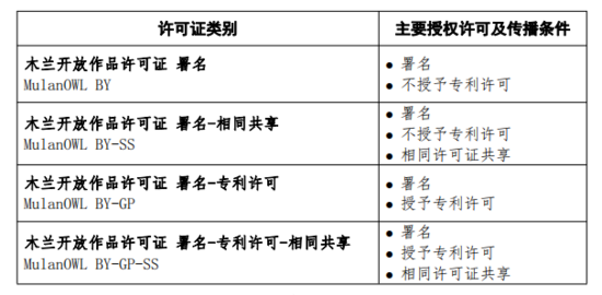 目前根据不同的授权要素及传播条件,共产生四个许可证,如下表所示(许可证征求意见稿请在附件1-4中下载):