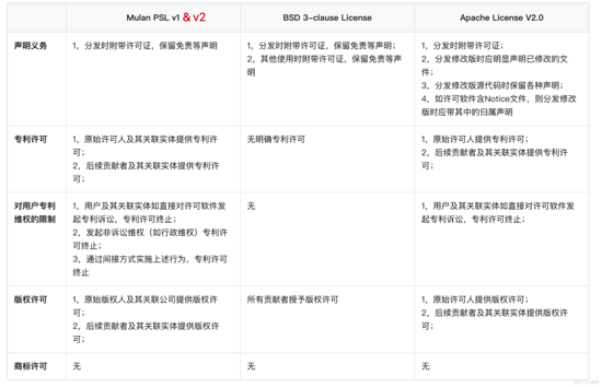 Mulan PSL v1 & 2 与BSD 3-clause License与Apache License V2.0在声明义务、专利许可、对用户专利维权限制及版权许可上均有差异,在商标许可上无差异,见下表: