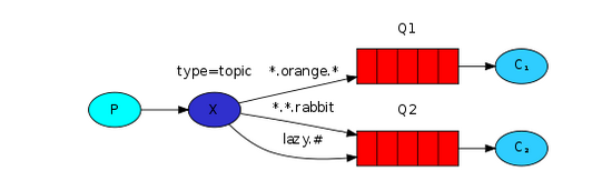主题模式 是将路由键根据一个主题进行分类,和 直连模式 不同的是, 直连模式 绑定 特定 的路由键,而 主题模式 使用通配符绑定路由键,绑定键有两种: