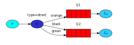 路由模式 使用 直连交换机 ,该模式下根据 routingKey 绑定特定的队列。