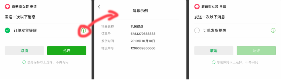 有的人会觉得:让用户选择是否收到消息,用户所需要的操作就多了,弹窗也是对用户的一种打扰。如果用户不熟悉订阅消息或者直接点了“取消”,小程序就没法通知到用户了,用户可能因此错失服务,对商家和用户都是损失。