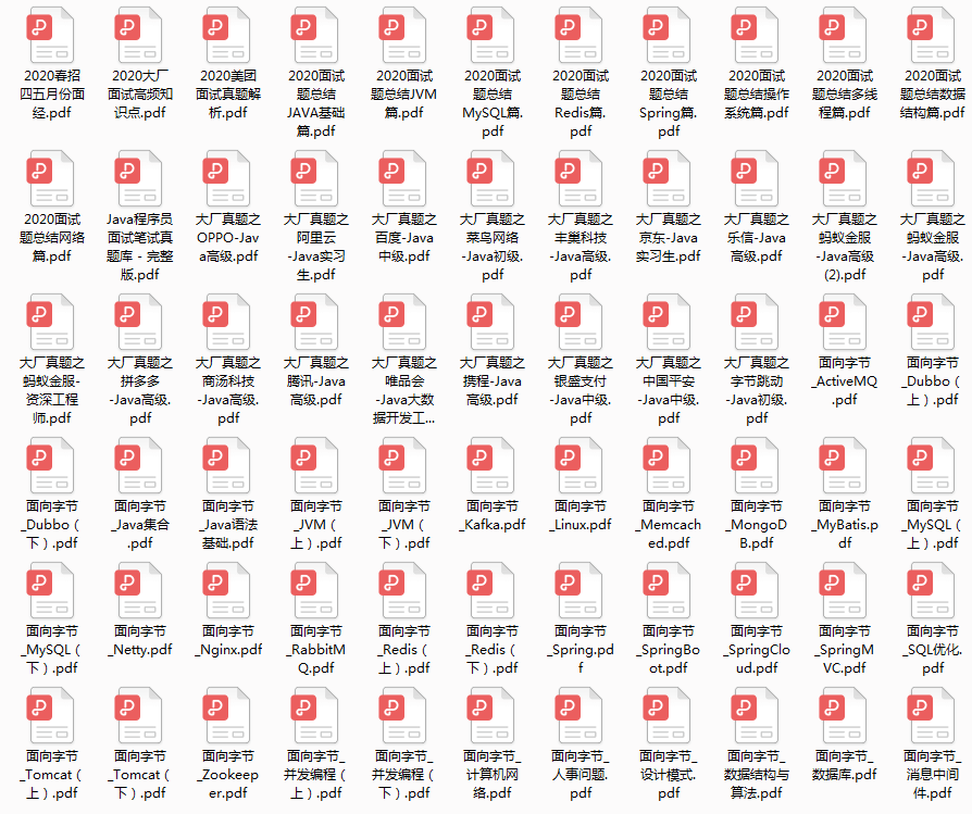最后在这里我分享一份自己收录整理了一套2021年的春招中高级面试题,把技术点整理成了PDF(实际上比预期多花了不少精力),由于篇幅有限,这里以图片的形式给大家展示一部分。