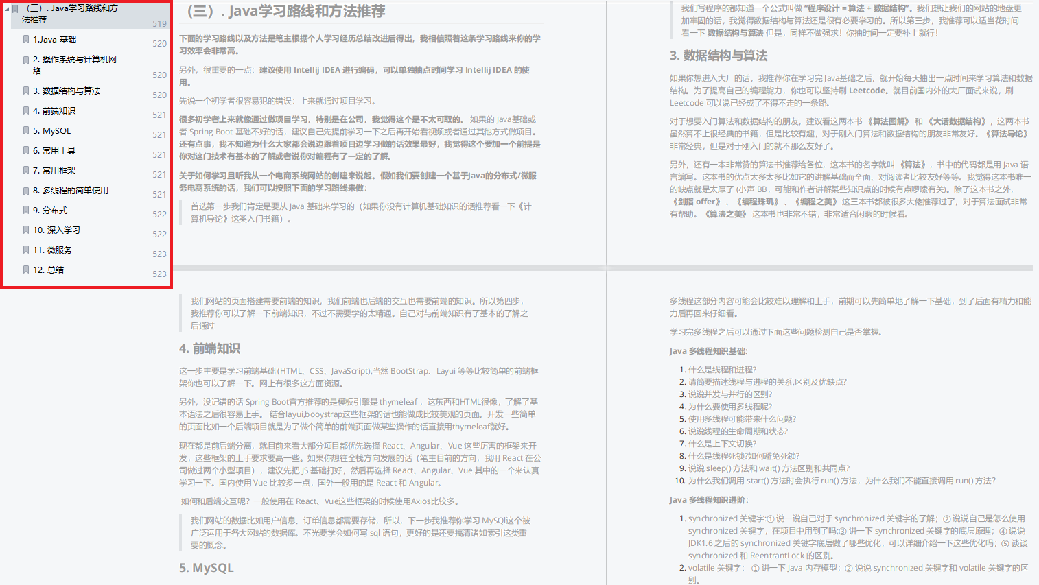 这份笔记内容涵盖:Java(基础、容器、并发、JVM)、计算机网络、Linux、数据结构与算法、数据库(MySQL、Redis)、系统设计(RestFul API、常用框架、认证授权(JWT、SSO)、分布式、大型网站架构、微服务)、必会工具(Git、Docker)、面试指南(程序员简历该怎么写、如何准备面试、Java学习路线和方法推荐)。