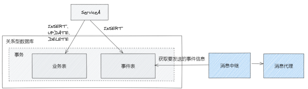 事务性消息的实现一般是通过发送事件的服务维护额外的事件表,在发送消息前将发送的事件消息内容与类型写入对应的事件表中,使得业务代码与发送事件都可以通过数据库本地事务保证一致性,即最终状态满足事务原子性要求,最后再通过额外的消息中继服务获取事件表的事件信息并保证事件发布的可靠性;