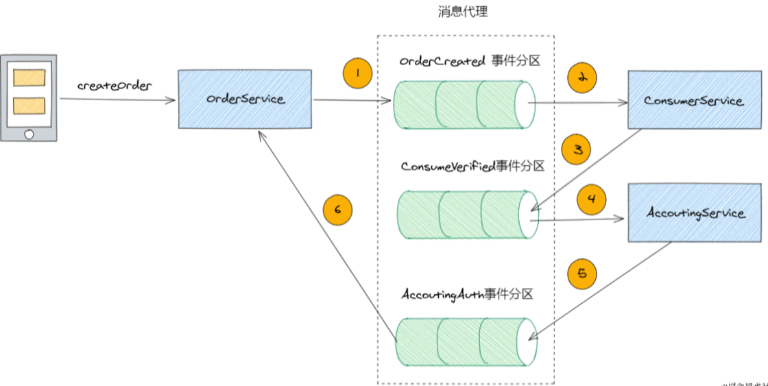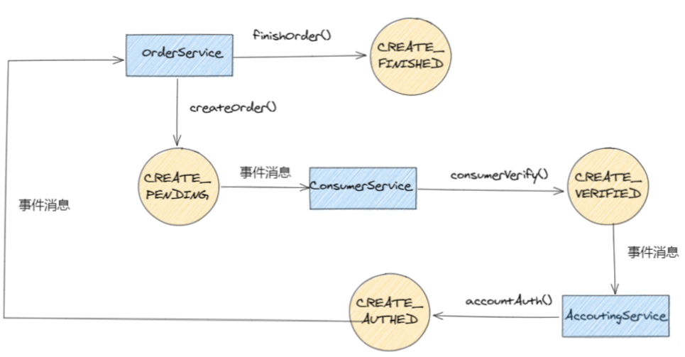 以下图为例,OrderService接收到客户端的createOrder请求后,便会创建Order对象并生成OrderCreated事件投递到消息代理中;而ConsumerService向消息代理订阅了OrderCreated事件,并且对应的事件处理器为consumerVerify()方法,处理成功便会向消息代理中投递ConsumeVerified事件;而AccoutingService向消息代理订阅了ConsumeVerified事件,对应的事件处理器为accountAuth()…